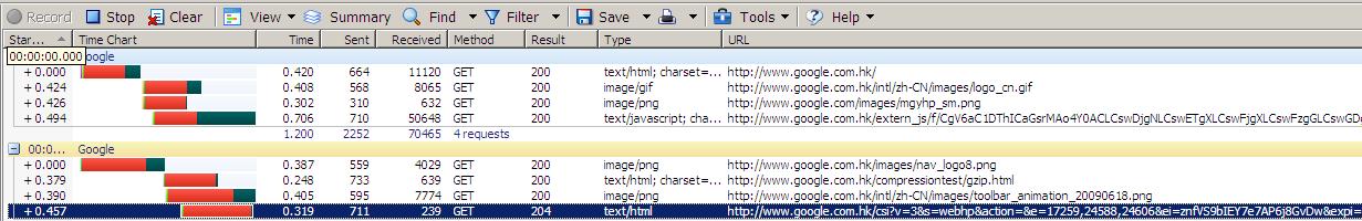 cnblogs总共有5个cookie值,而且全部设置都是 path=/ domain=.cnblogs.com。知道了cookie的设置后,我们再来监控下博客园首页的请求,监控的统计信息如下: