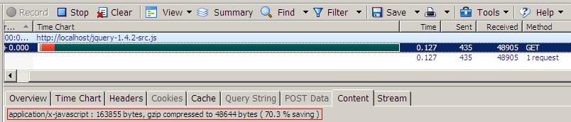 我们先看看gzip的压缩比率能达到多少,这里用jquery 1.4.2的min和src2个版本进行测试,使用nginx服务器,gzip压缩级别使用的是4:
