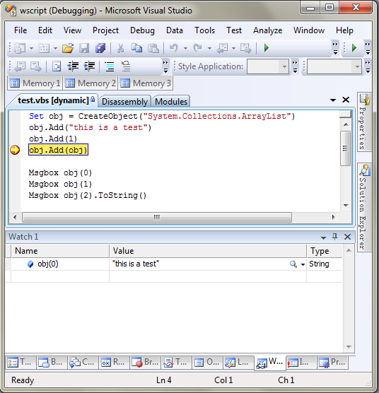 这样,我们可以使用两种方法在Visual Studio里面调试脚本程序,这里我只介绍第二种方法 -- 第一种方法不知道为什么我的Win 7 + Visual Studio 2008不能工作,:(。