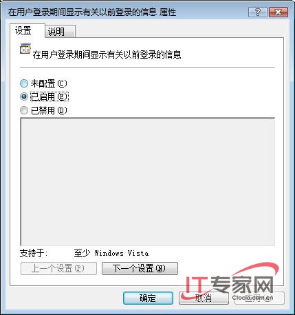 检查该对话框中的“已启动”选项是否处于选中状态,如果发现它还没有被选中时,我们只要将它重新选中,再单击“确定”按钮保存好上述设置操作,如此一来本地Windows Vista系统就具有自动记录上次登录系统时间的功能了。
