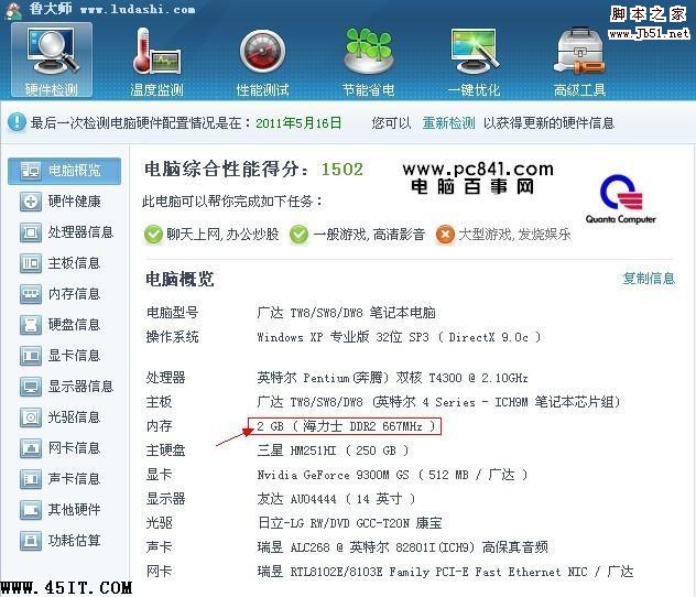 从以上资料中我们可以看出电脑内存的品牌是“海力士” 电脑内存的类型是:“DDR2” 主频是:“667MHZ”相对与目前主流2G内存来说该内存比较差。