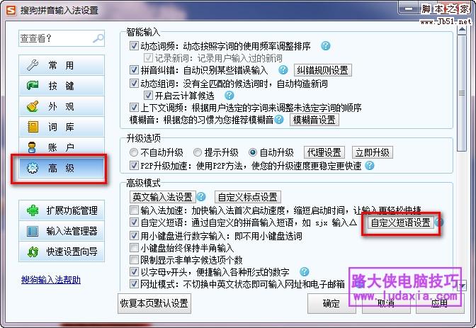 然后,选择左侧的”高级”,点击对话框中的“自定义短语设置”,下图:
