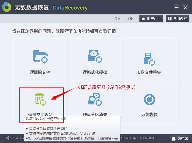 第二步:打开无敌数据恢复软件,用户将可以看到整个软件的基本界面。选择“误清空回收站”选项进入到下一步。