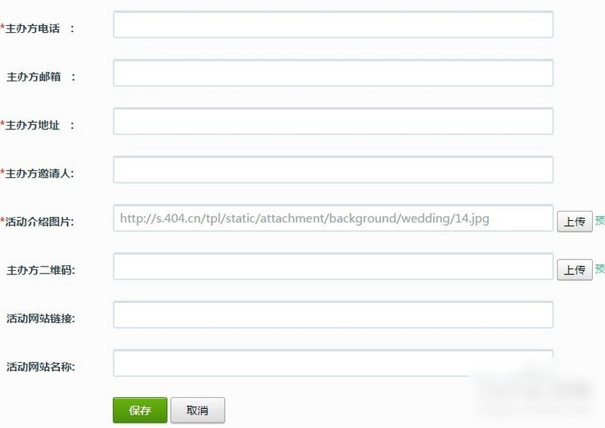 6、填写里面的关键词、回复标题、图片、内容介绍等回复配置。完成后填写活动配置信息,包括封面图片、背景图、主办方信息,二维码,关注等一系列内容。