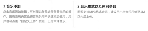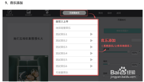 9、添加音乐,数据库内置多个音乐素材可供添加,也可以自定义本地音乐,需注意的如果是>1M的音乐需压缩至1M以内再上传