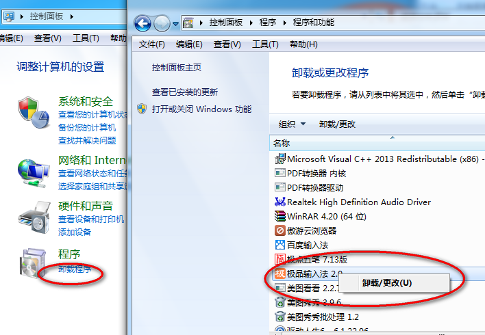 方法二:开始菜单==控制面板==卸载程序==找到“极品五笔”右击卸载/更新