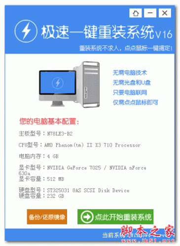 重装系统是很多电脑小白的一块心病,每次都要研究半天或者到处求人重装。现在的市场价是30元重装系统,今天脚本之家给你一次“重生”的机会,教你一招极速一键重装系统,以后电脑再也不求人,所有问题都可以靠重装来解决。极速一键重装系统还你一个清新的系统环境。永久免费,无需光驱和U盘,无需电脑技术,傻瓜式操作,快快来下载吧。