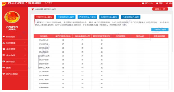 在组织树集中建立阶段,系统为各级团委、团工委、团总支管理员提供了下级组织信息录入进度提示、查看功能。当进行到下级组织录入阶段时,本级团组织管理员登陆系统,系统会自动弹出下级组织录入进度查看窗口。各级团组织管理员也可以进入管理中心,在组织管理功能中查看下级组织信息录入进度。