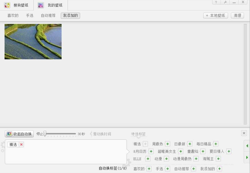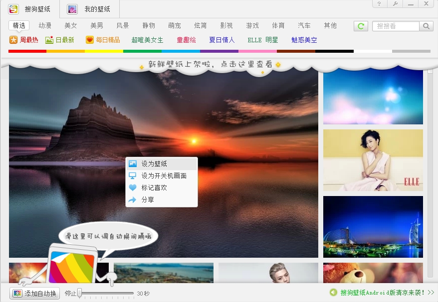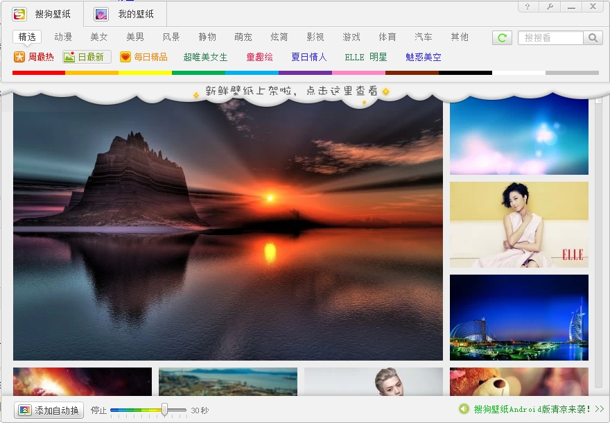 在搜狗壁纸左下角很明显看到一个"添加自动换"按钮,这个功能键可以帮你的桌面自动换壁纸哦,不过最大的间隔时间只有30秒