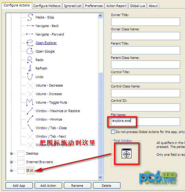 2:在左侧列表选中刚才添加的应用程序(IE10),然后拖动“查找窗口”下面的图标到IE10窗口,StrokesPlus将自动获取有关该程序的信息,并删除“查找窗口”上面所有文本框中的数据。