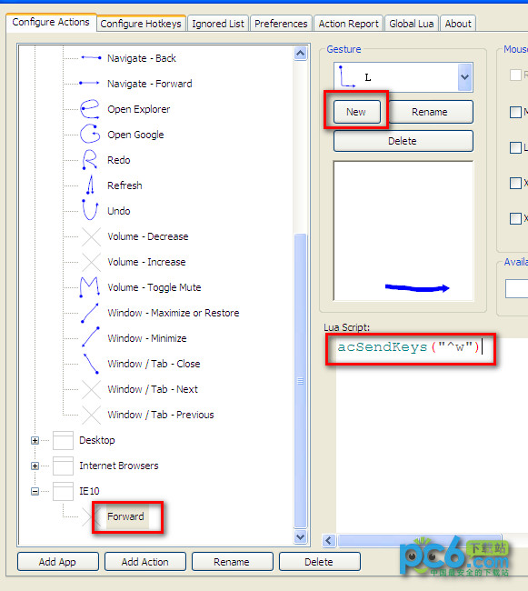 4:先选中第3步添加的动作(close TAB),然后在"手势"下拉列表中选择一个已有的鼠标动作(当然你也可以点击"新建"按钮来录制新的动作),在"Lua 脚本"下面的文本区域输入已替换为StrokesPlus代码的关闭标签键盘快捷键命令:acSendKeys("^w") .点击应用,确定。