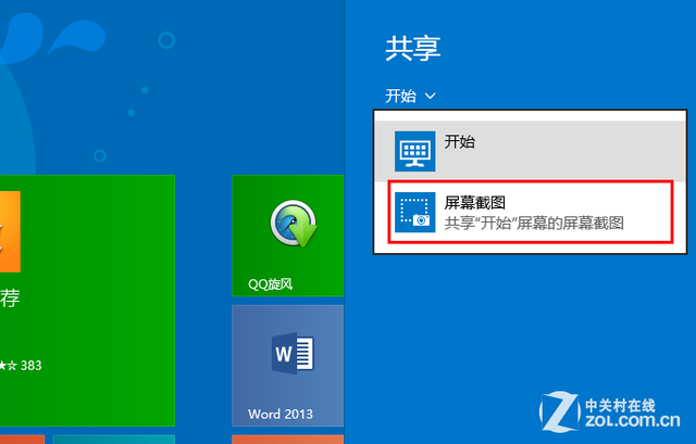 这还仅是在传统桌面模式下的,其实在开始屏幕和Win8.1应用中我们有更多可以操作的空间。在“开始屏幕”我们用一样的方法打开“共享”就可以看到截屏的选项,然后还会提示“选择一个应用开始共享”。