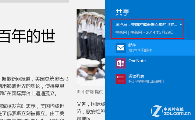再看看“资讯”应用,这时候只要在一篇文章中点击“共享”,就能够把整篇文章作为内容进行分享。而且系统会自动识别分享的内容,提供相应的应用途径,项这里就可以选择邮件、OneNote和阅读器。