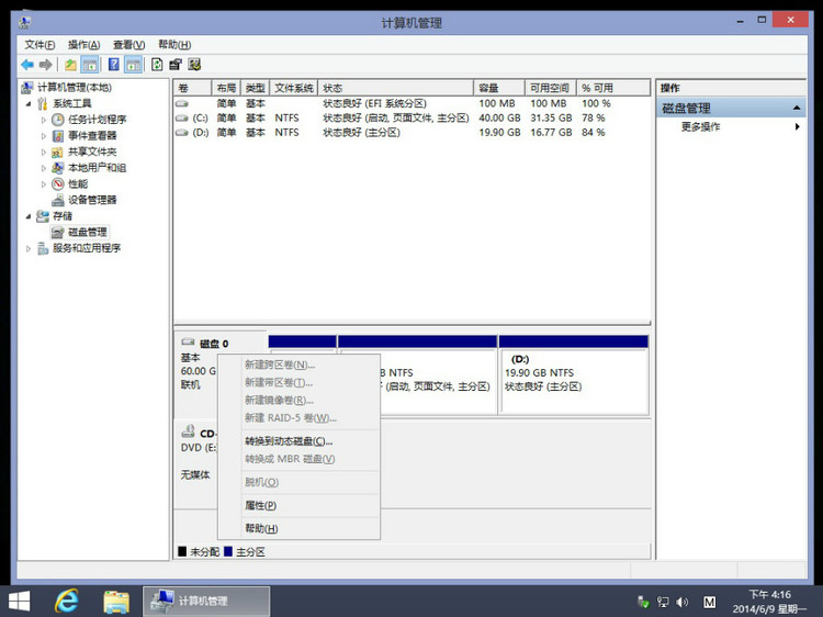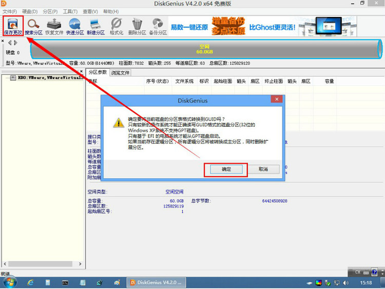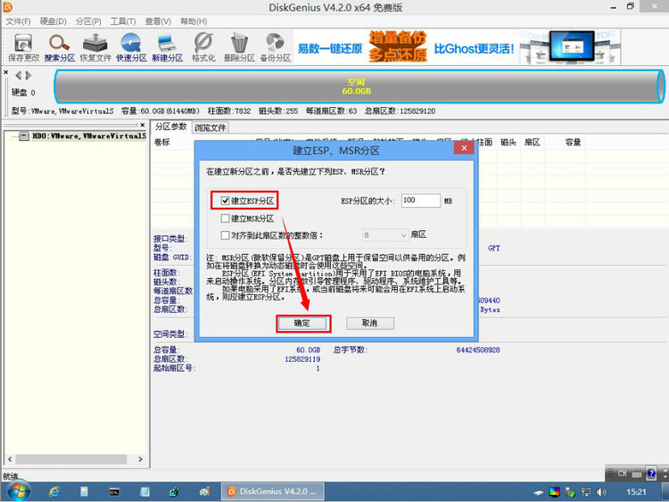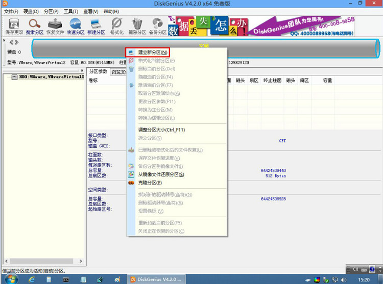 这里要注意的是,如果你当前硬盘已经有数据了,且不想影响数据,则请下载DiskGenius专业版,并运行64位专业版。因为PE里的DiskGenius是免费版,不支持在数据无损的情况下MBR转GPT或GPT转MBR。这里实验的环境是空硬盘,所以直接建立GPT分区。如下图: