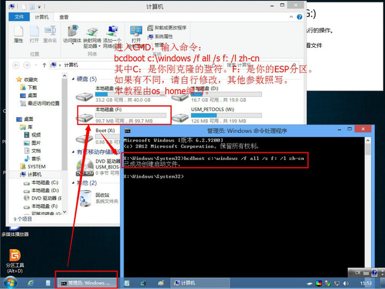 5、输入命令把启动信息指去你的ESP分区。如下图: