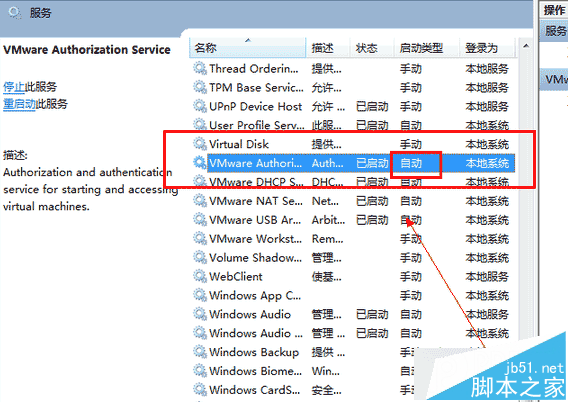 6、在服务列表中找到VMWare Authorization Service,并将其设置为自动启动并且开启服务即可。