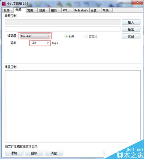 选择音频编码器(建议选NeroAAC)和码率(建议选128Kbps)