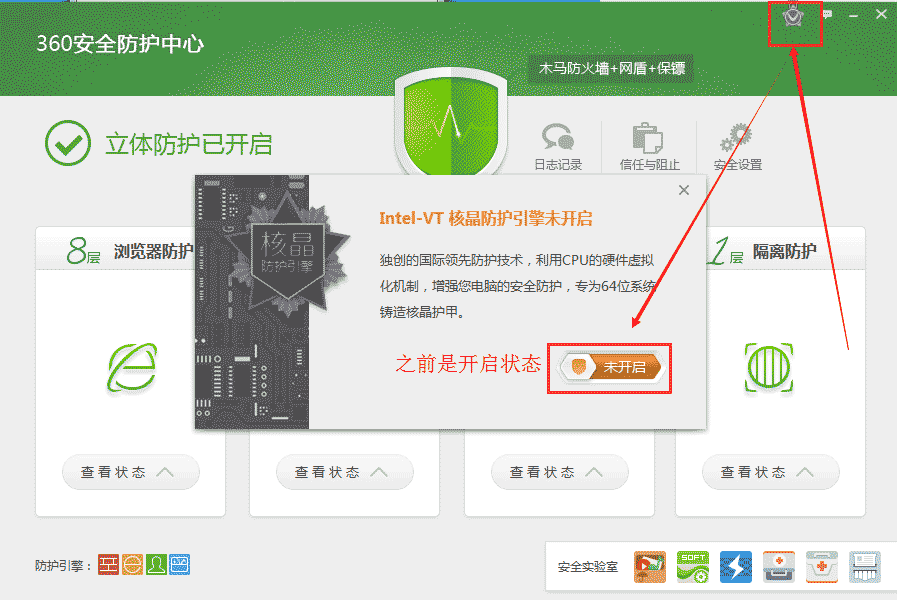 那么为什么支持VT-X,BIOS也设置了enabled却还是不能正常启用VT-X了?后来就往这方面想,会不会就是卫士类的阻挡?终于百度到360核晶防护是与VT-X有关的,果然在360上发现这个功能是开启了的。