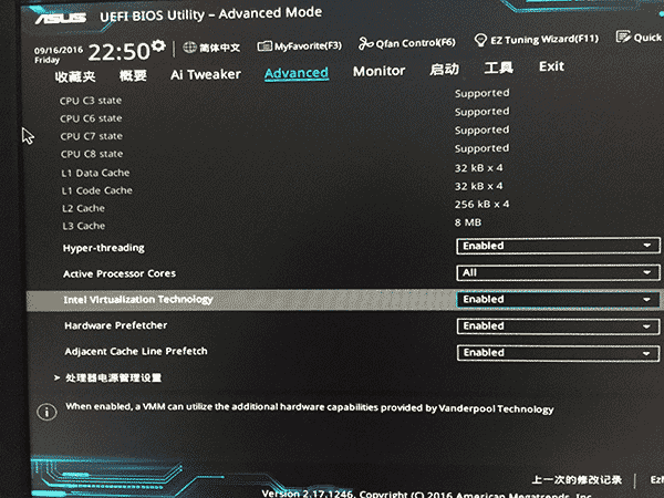 之后就是一顿度娘,发现千篇一律都是检测CPU支不支持虚拟化,支持的话去BIOS里设置虚拟化技术设置为enabled。