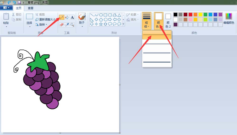 6、高光:点击“铅笔”按钮,线条粗细(第一个),颜色1改成白色,再每个葡萄底部都画上一笔。