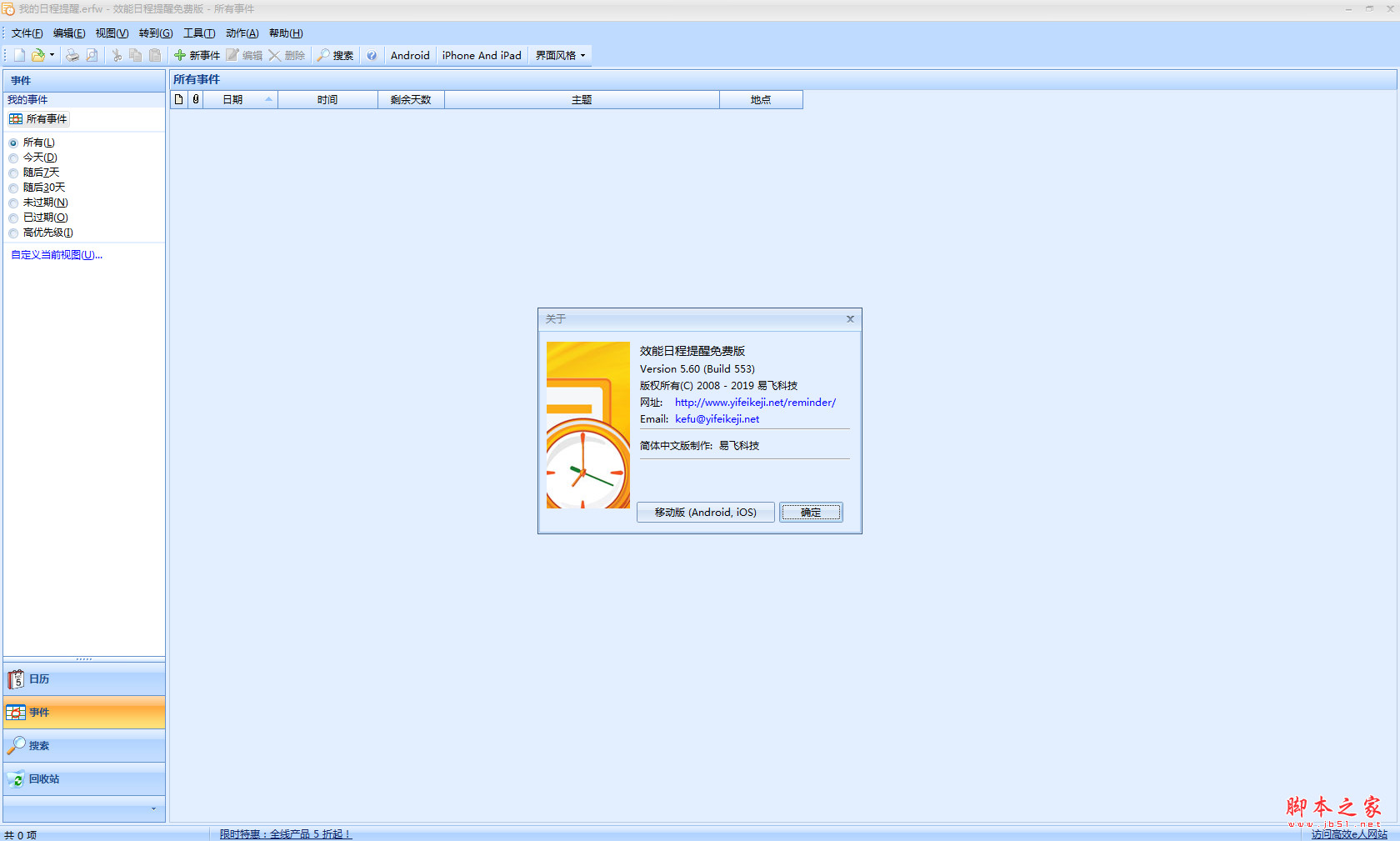 这是一个忙碌的时代!这是一个充满激情的时代!我要让我的工作和生活井井有条,面对再多的约会、会议和事务安排我都能从容面对!因为,我拥有效能日程提醒软件!有了她的帮助,会议我从不迟到;和恋人约会,我能让她惊喜;每月电话费能及时缴纳;妈妈的农历生日我能及时准备;甚至某个节气将至软件也可以提醒我!通过直观的天、工作周、周、月或者年的日历视图,对哪天将要有什么事情一目了然;我也可以通过列表形式查看事件。软件还支持按分组管理事件、导入预定义节假日、指定不同颜色的事件标签、对事件按优先级管理、回收站等诸多功能。还犹豫什么?现在就使用效能日程提醒软件,体验从容面对工作和生活的惬意吧!