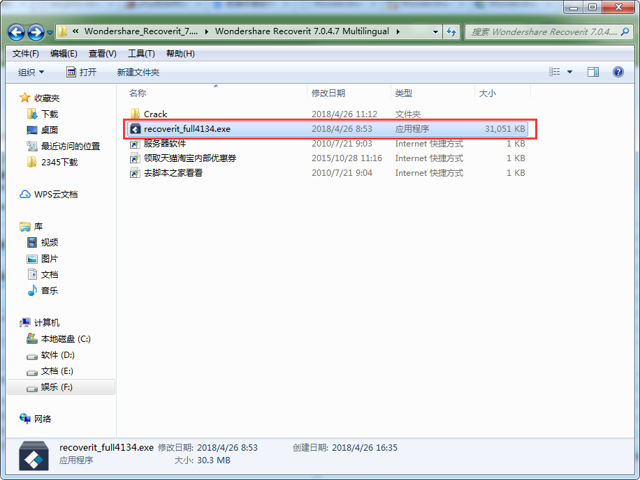 1、在本站下载软件并解压缩后,双击“recoverit_full4134.exe”程序