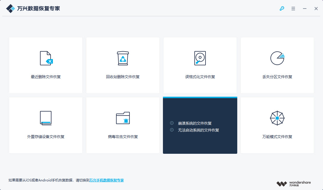 让万兴数据恢复专家运行起来,让已丢失的数据恢复过来。请先选择“系统无法启动数据恢复”模式。