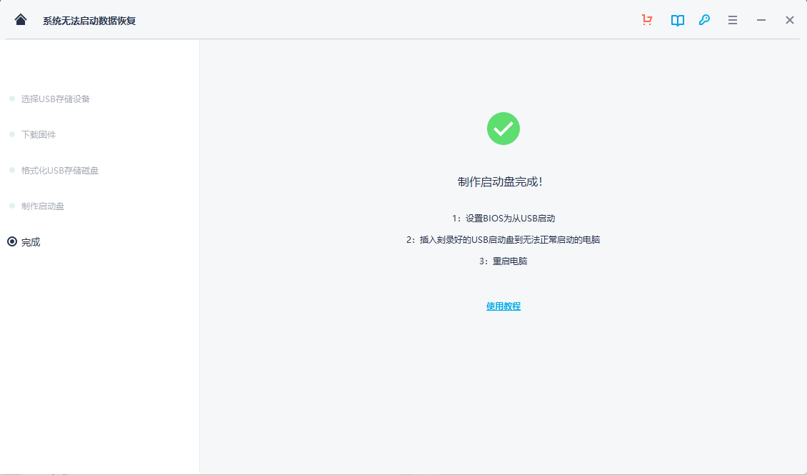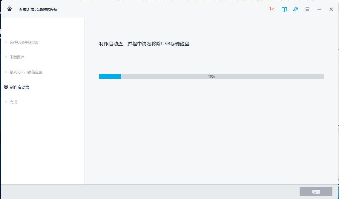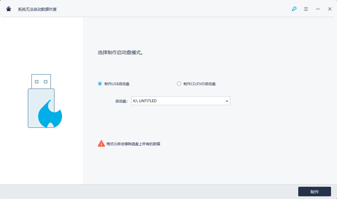 启动盘可以帮助你提取已崩溃系统的数据。因此,当你的Windows系统无法启动时,赶快先制作一个启动盘吧。点击“开始”继续。