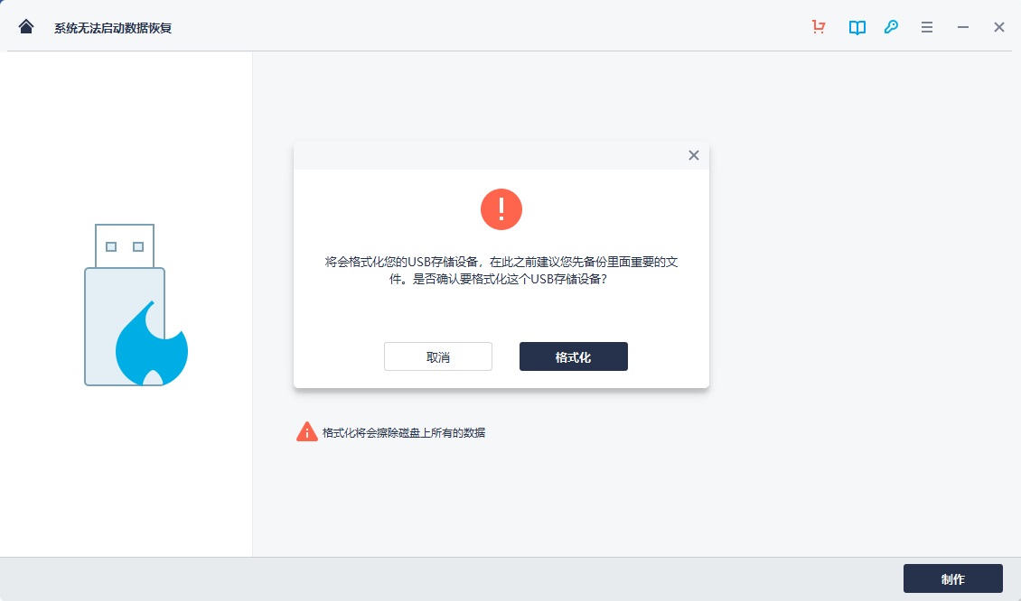 随后,会有一条警告信息弹出来。请不要被吓到,那只是提醒你要记得提前备份好启动盘中的重要数据,以防丢失。若是备份好后,点击确认“格式化”。