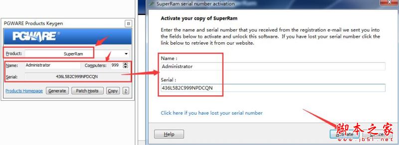 12、运行软件包里的Keygen.exe注册机,在Product里选择SuperRam,将注册机生成的用户名及注册码,填入软件注册界面相应的信息里,点击Activate(注操作此步骤时一定要断网,否则注册不成功的)