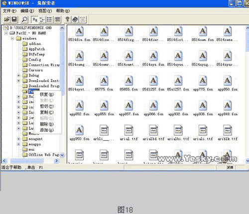 2.随时更新映像文件。就像Windows Me中的系统还原一样,一旦系统的软硬件发生变化,你就必须重新制作映像文件,虽然Ghost工作的速度可以达到80MB/min,但所花费的时间仍然十分惊人。其实,只要从Ghost Explorer中的“Edit(编辑)”菜单下选择“Add(添加)”命令就可以随时对映像文件进行更新。和标准的Windows资源管理器一样,Ghost Explore也支持鼠标的直接拖放功能,也就是说你能够把一个文件/文件夹直接拖拽到桌面上进行解压缩,或者是将一个文件/文件夹通过拖拽方式很方便的添加到.gho文件中。所以,在它的帮助下,你就能很便捷的把自己需要的工具添加到备份文件中,并且把备份文件中不需要的垃圾给清理出去。 (如图18)