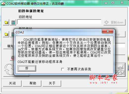 需要注意的地方:在新地址和旧地址的后面一定要加上斜杠“/” 。如果输入的地址不对,下面的状态栏会显示“未准备好 - New address does not exist” 只有当你填写的地址正确后,才会显示“准备 - 两者地址已存在”,这时才可以安全的开始移动。压缩包里有一个说明文本COA2.hlp,参照说明操作就可以了!