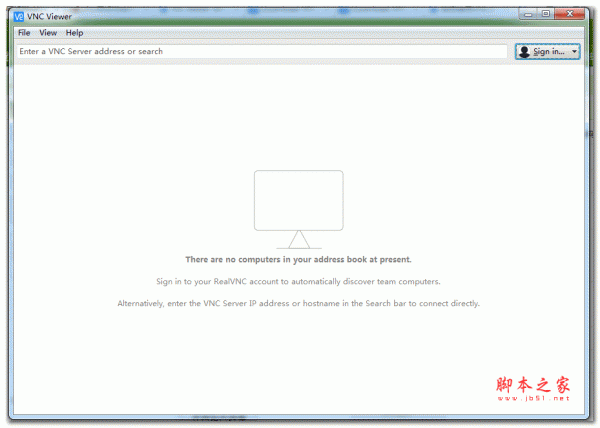 在台式机服务器上开启 VNC Server后,在笔记本客户端上打开 VNC Viewer,主界面如下,相当简洁,你可以直接在上方数据栏里输入服务器端的主机名或IP地址,即可建立连接。
