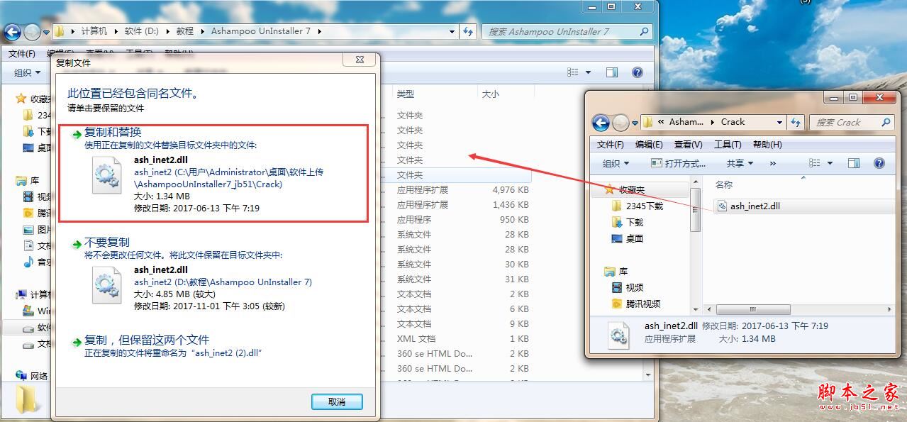 2.找到文件的安装目录后,再将安装包中的破解文件“ash_inet2.dll”复制到文件的安装目录中,选择“复制和替换”,即可破解,如下图