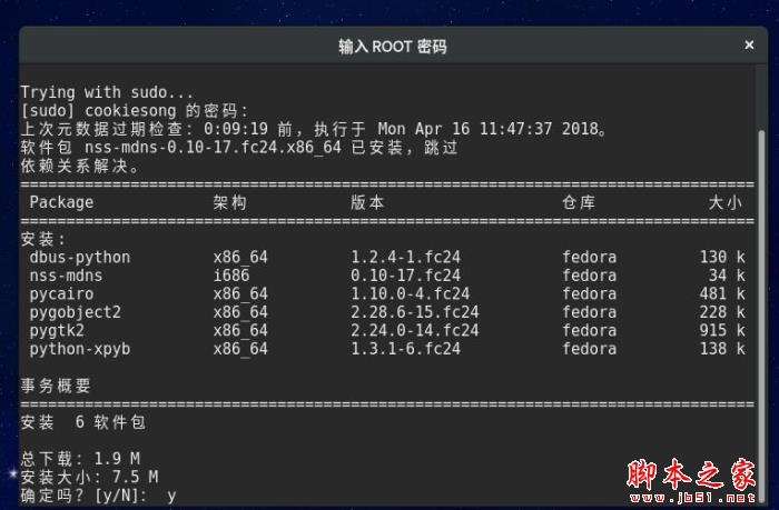 6、如果安装包邮缺失的话会出现终端让我们进行安装缺失的包,输入密码然后回车键,然后就会进行安装,中途会让我们确认是否继续,输入“y”,结束后按下回车键即可;