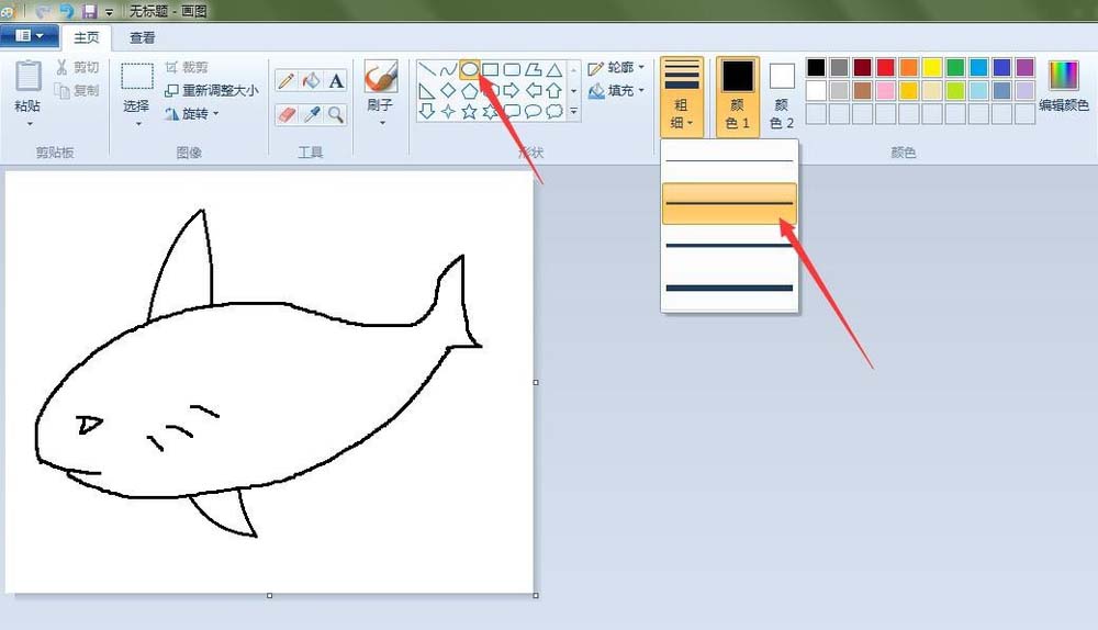 2、身体:点击“铅笔”按钮,线条粗细(第三个),先画出鲨鱼的身体部位。