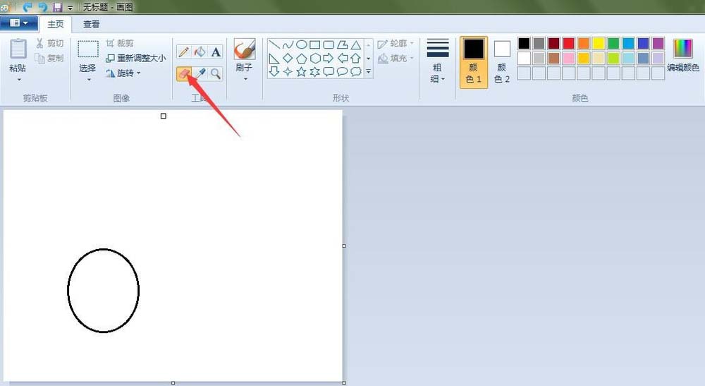 2、羽毛球的头部:点击“椭圆形”按钮,线条粗细(第二个),先在“画纸”适当位置上画上一个椭圆;点击“橡皮擦”按钮,将画好的椭圆擦掉一些;点击“曲线”按钮,在如图的地方画两条曲线。