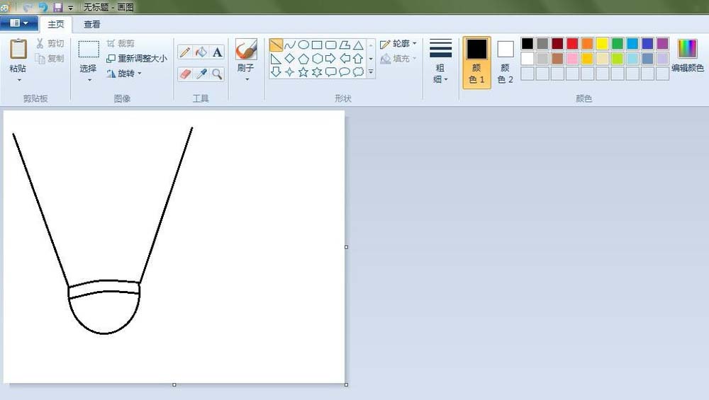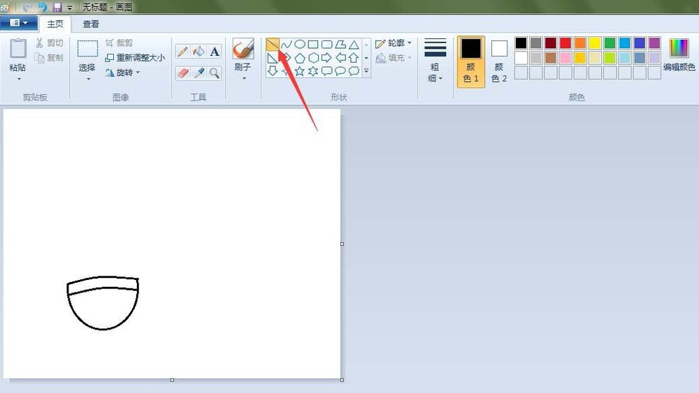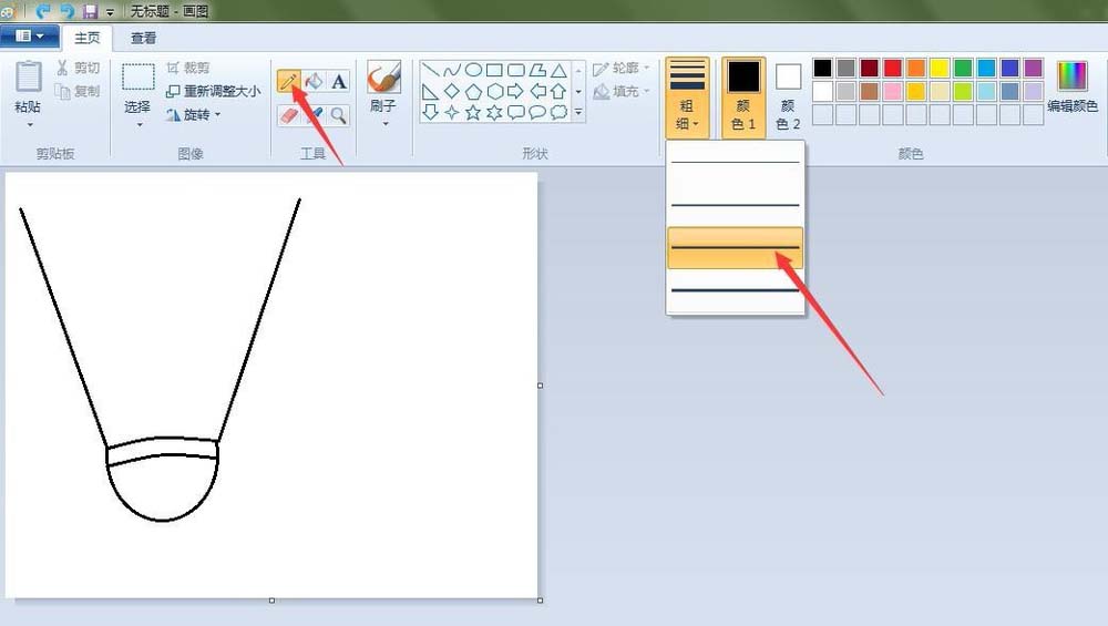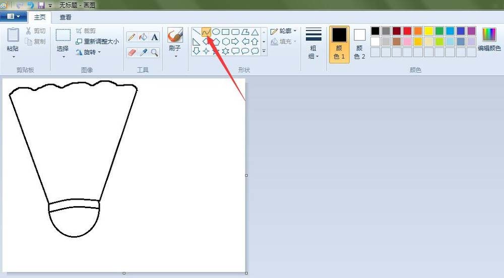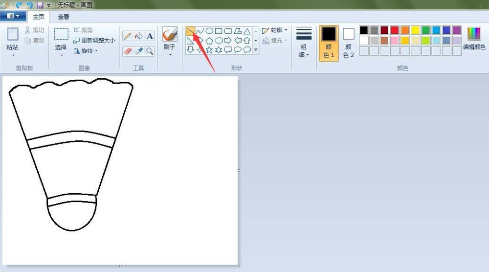 3、羽毛球的羽毛轮廓:点击“直线”按钮,在如图的地方画两条直线;点击“铅笔”按钮,线条粗细(第三个),在如图的地方画出弧度线。