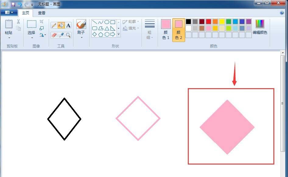 11、在菱形内部点击一下鼠标左键,给菱形填充上颜色,用这样的方法我们就可以在画图中绘制出自己想要的菱形。