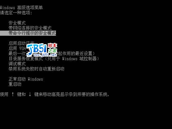 1、重新启动计算机,按住F8键,在“Windows 高级选项菜单”中选择“带命令行提示的安全模式”,并回车。