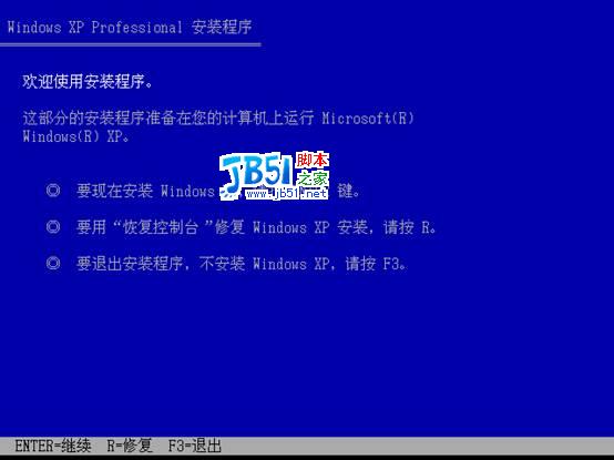 3、用Windows安装光盘重新启动计算机,在提示界面中按“R”进入“恢复控制台”。