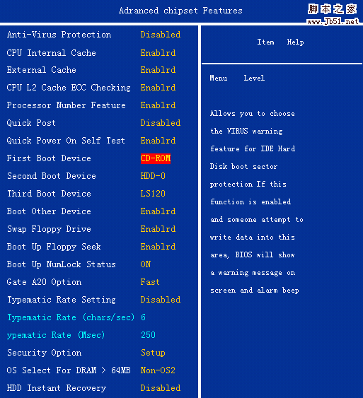 2、用“↓”移动光标到"First Boot Device",用PageDown键选择为"CDROM".