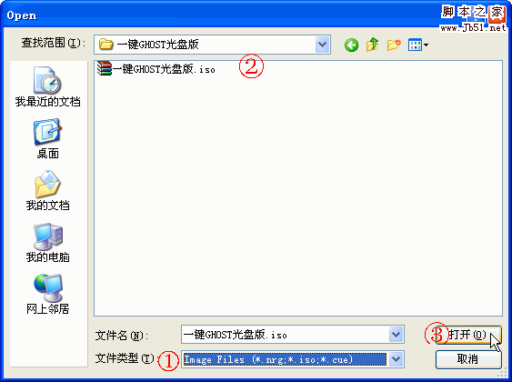 2、选择"文件类型"为"图像文件(*.nrg,*.iso,*.cue)" -> 找到"一键GHOST光盘版.ISO"->"打开"