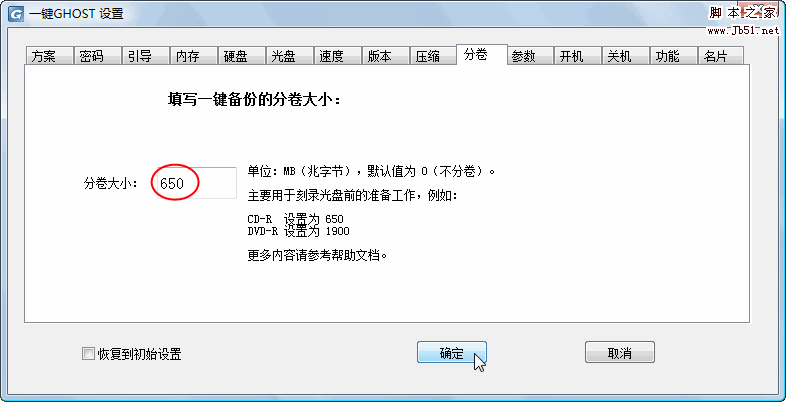1、准备:使用WINDOWS下运行一键GHOST硬盘版->设置->压缩、分卷