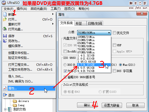 (如果刻录DVD光盘,请点击"文件->属性->介质->选择 4.7G",如图)