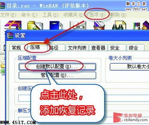 Step 01打开压缩文件,在“选项”菜单栏中选择“设置”选项,然后在新弹出的设置窗口中,需要进入“压缩”选项卡,在该选项卡下有个“压缩配置”的设置项,点击其中的“创建默认配置”按钮。