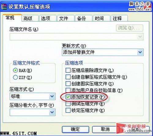 Step 02然后会弹出一个名叫“设置默认压缩选项”的窗口,进入“常规”选项卡,在该选项卡的右下部分中有不少的压缩选项,勾选其中的“添加恢复记录”,然后再进入“高级”选项卡,在恢复记录中设置百分比为3%,然后点击“确定”就OK了。