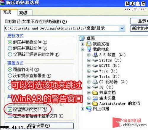 Step 03如果是从网络上下载下来的压缩文件,而且该压缩文件没有复原记录的话,只能赌一下运气了。打开该压缩文件,点击“解压到”,在弹出窗口中勾寻保留损坏的文件”来跳过WinRAR的警告窗口,看能压出多少档案,只要毁损的情况不严重,能正常使用的几率也很高。