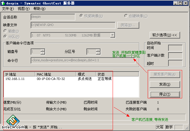 点发送 开始传输 恢复镜像到客户机第一个磁盘第一个分区.如图19,20
