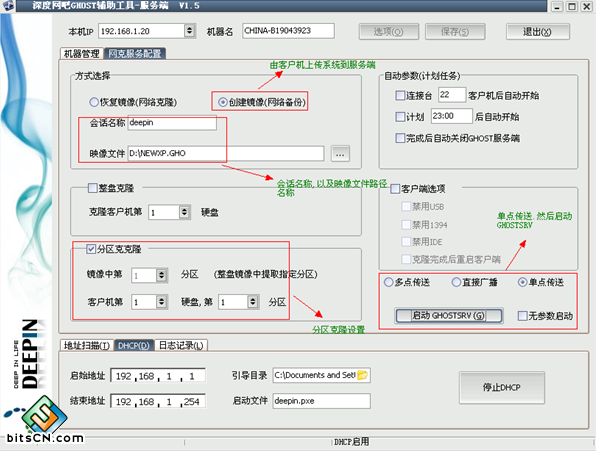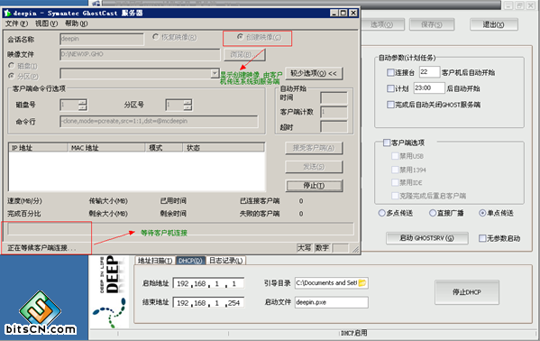 网刻服务端设置,创建镜像,是下面客户机装好系统, 然后上传到服务端机器指定目录,指定命名文件.分区克隆设置镜像中第一个分区,客户机第一块硬盘,第一个分区,单点传送,启动 ghostsrv 如图8